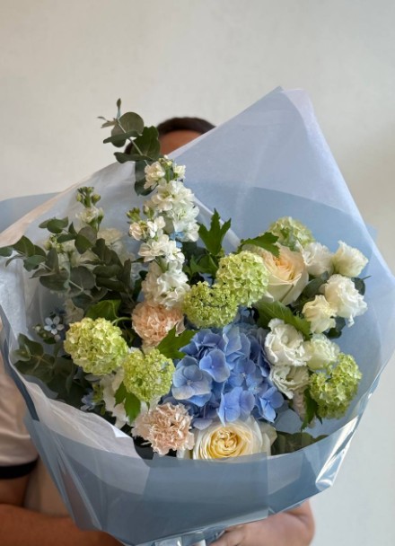 Нежный и многоуровневый букет в пудрово-пастельной гамме. Пышная гортензия, ароматная маттиола, изящные розы и диантусы сочетаются с воздушной эустомой, эвкалиптом и акцентами оксипеталума и вибурнума. Элегантная композиция с лёгким природным характером — для поздравлений, любви и вдохновения.