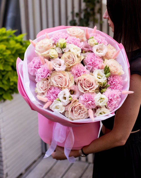 Skład: eustoma, lagurus, róża „Mondial”, dianthus.