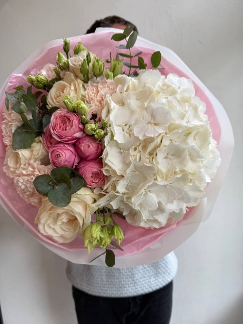 Delikatny i zrównoważony bukiet z pudrowymi akcentami. Hortensja i róża „Silva” nadają objętości, eustoma i dianthus dodają miękkości, a eukaliptus wprowadza lekki, naturalny akcent. Uniwersalny bukiet na każdą okazję — od randki po „tak po prostu”.