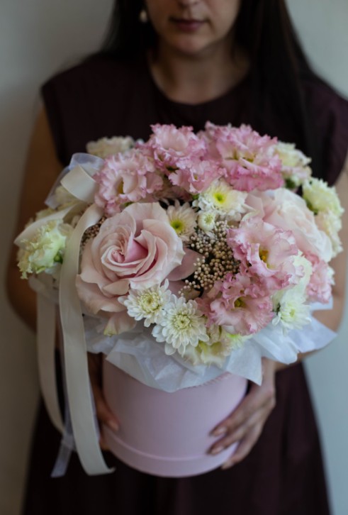 Delikatna i zwiewna kompozycja w poręcznym pudełku kwiatowym. Połączenie eustomy, goździków, chryzantem i eleganckiej róży francuskiej dopełnia lekka mgiełka ozothamnusa. Uniwersalny prezent na każdą okazję — lub po prostu od serca.